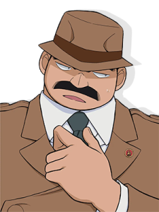 Notable Traits: Always seen wearing his brown trench coat and signature hat; has a scar on his head from a past case; has a history consulting with famous detective novelist Kudo Yusaku. Known for his calm presence at crime scenes.